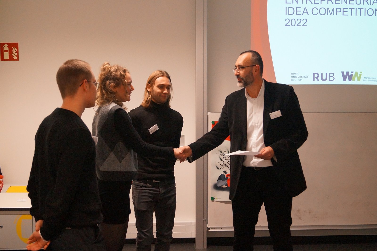 Die Beiträge wurden von der Jury, bestehend aus dem Dekan Prof. Dr. Michael Roos und der Prodekanin für Finanz Strukturentwicklung Prof. Dr. Nicola Werbeck, Dr. Anna Talmann, Dr. Fabian Schmitz, Lea Decker und Ndjiba Antonio der Fakultät für Wirtschaftswissenschaft/CEIT, dem Vertreter der Santander Bank Daniel Sogorski sowie Maurice Reinhard und Jannis Heuner von der Bochumer Wirtschaftsentwicklung, gesichtet und bewertet. Am 16. Dezember fand die Prämierung der Siegerteams statt. Es wurden fünf Teams prämiert, die aufgrund überzeugender Beiträge mit 1.500 Euro ausgezeichnet wurden.