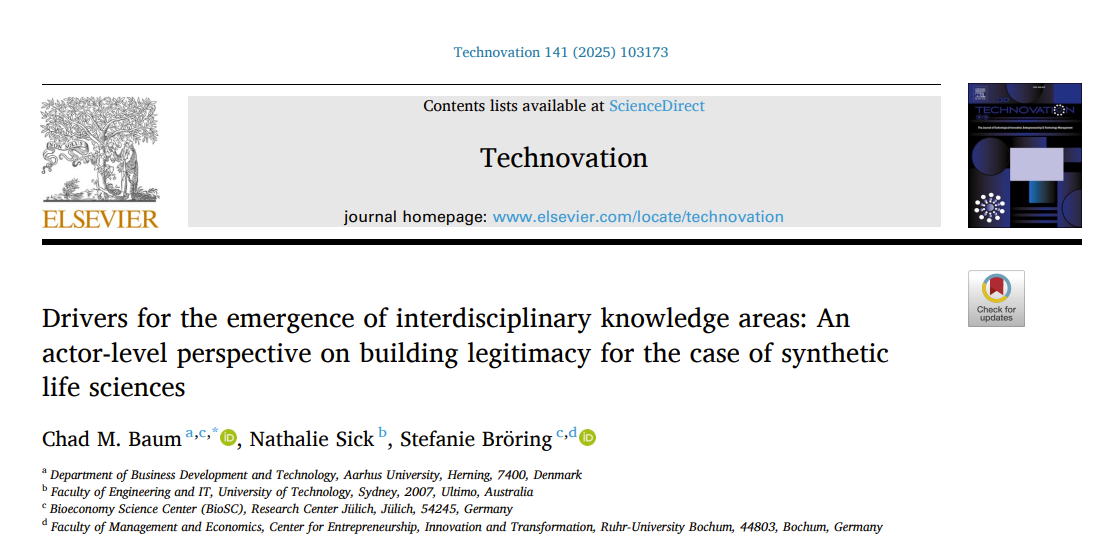 Gemeinsam mit Dr. Chad Baum von der Aarhus University und Dr. Nathalie Sick von der University of Technology Sydney hat Prof. Dr. Stefanie Bröring einen neuen Artikel über die Treiber interdisziplinärer Wissensfelder in Technovation veröffentlicht. Sie verwendeten den Mixed-Methods-Ansatz des Group Concept Mapping, um die Treiber und Hemmnisse für neu entstehende interdisziplinäre Wissensfelder – in diesem Fall die synthetische Biologie – zu untersuchen.