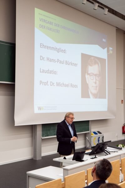 Zum Ende des offiziellen Teils wurde es noch einmal sehr feierlich, als zwei langjährige Unterstützer für Ihre vielfältigen Tätigkeiten mit der Ehrennadel der Fakultät ausgezeichnet wurden. Zu Ehrenmitglieder ernannt wurden Dr. Hans-Paul Bürkner mit einer Laudatio von Prof. Dr. Michael Roos und Prof. Dr. Ernst Zander mit einer Laudatio von Prof. Dr. Brigitte Wernes.