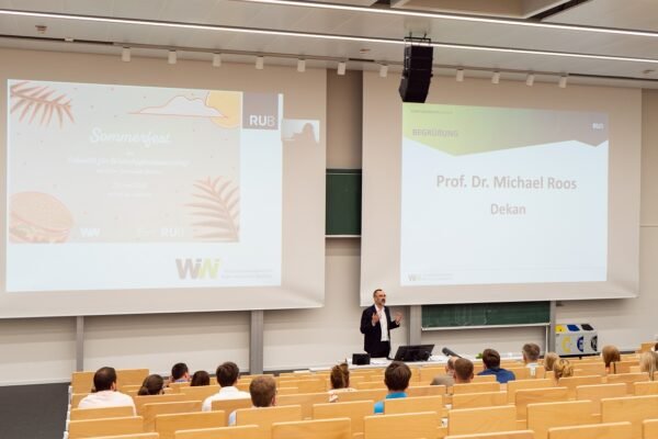 Das Programm startete mit einer Begrüßung durch den Dekan, Prof. Dr. Michael Roos. Er rekapitulierte die Chancen und Herausforderungen, die die Coronazeit für die Fakultät und ihre Mitglieder mit sich gebracht hat. Zudem gab er einen Ausblick auf die kommenden Aufgaben. Anschließend stellten die vier neuen Professor:innen (Prof. Dr. Andreas Löschel, Prof. Dr. Martin Nienhaus, Prof. Dr. Thushyanthan Baskaran, Prof. Dr. Stefanie Bröring) der Fakultät sich und ihre Teams vor.