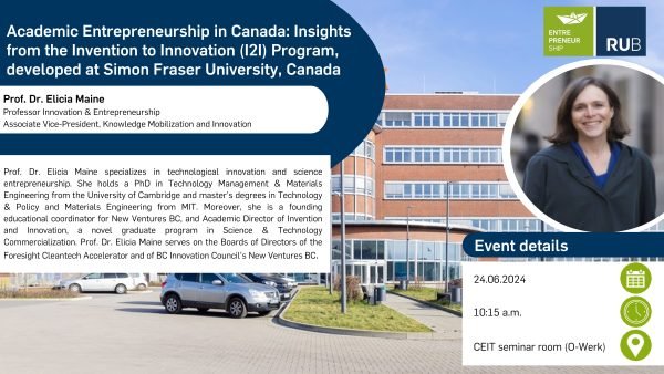 Am 24.06.2024 wird Prof. Dr. Elicia Maine (Simon Fraser University, Kanada) am Lehrstuhl für Entrepreneurship und innovative Geschäftsmodelle zu Gast sein und zum Thema Academic Entrepreneurship referieren. Sie wird uns spannende Einblicke in das Invention to Innovation (I2I) Programm geben.